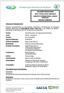 Roberto Nassar e Josué Heliodoro, técnico e atleta do Flamengo estão em Berlim para a Junior Team Cup de Ginástica Artística Masculina. Eles foram convocados para a seleção brasileira de ginástica artística masculina premiando o sério trabalho que está sendo realizado na modalidade. O evento será de 04 a 07 de abril na Alemanha. Aproveitamos a oportunidade para parabenizar Roberto pelo seu aniversário hoje, sábado , 30/03/2019. Esta convocação já foi um grande presente ! Desejamos ótimos resultados !