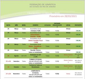 Calendário provisório 28/03/2021 melhorweb2021-04-20T17:03:09-03:00Categorias: 2021|Etiquetas: calendário, calendario 2021, Calendário provisório 2021, Calendário provisório 28/03/2021|Nenhum Comentário Compartilhe! FacebookXWhatsAppE-mail Notícias Relacionadas CBG – Propostas Regulamentos Provisórios 2022 30/12/2021 21:46 | Nenhum Comentário CBG – Circular Presidentes CP 088/2021 – Recesso Final de Ano e Férias Coletiva 30/12/2021 21:42 | Nenhum Comentário CBG – Circular Presidentes CP 087/2021 Ação da Comissão de Ciência e Educação (CCE) 14/12/2021 18:06 | Nenhum Comentário CBG – Circular Presidentes CP 086/2021 Ação da Comissão de Ciência e Educação (CCE) 08/12/2021 16:11 | Nenhum Comentário CBG – Boletim 004-2021 – GR 08/12/2021 16:10 | Nenhum Comentário CBG – Programação Detalhada – GYMBRASIL 2021 – Natal / RN 08/12/2021 16:08 | Nenhum Comentário Faça um comentário Cancelar respostaComentar