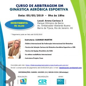 Luamar Martin, graduada em educação física, pós graduada em nutrição esportiva, atleta campeã brasileira e internacional de ginástica, técnica e coreógrafa premiada internacionalmente pelo Centro Esportivo Ramiro, pelo Rio e pelo Brasil e árbitra internacional será a ministrante do Curso de Arbitragem em Ginástica Aeróbica Esportiva.