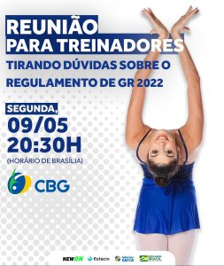 Dando seguimento as ações em prol do desenvolvimento da Ginástica Rítmica no país, estamos encaminhando as informações abaixo e o folder em anexo sobre a realização do Encontro de Treinadores de Ginástica Rítmica, onde o intuito será elucidar as dúvidas sobre o Regulamento de GR 2022, com o propósito de contribuir para o bom andamento das competições regionais e nacionais do corrente ano.