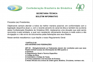 Encontrem em anexo Boletim Informativo: Situações recorrentes que ferem o Regulamento Geral da CBG. Boletim Informativo 270819 melhorweb2021-01-14T10:21:55-03:00Categorias: 2020, CBG, Documentação|Etiquetas: boletim cbg, cbg, regulamentos|Nenhum Comentário Compartilhe! FacebookXWhatsAppE-mail Notícias Relacionadas II ATUALIZAÇAO DE ARBITRAGEM CBG GINÁSTICA RÍTIMICA 28/04/21 30/04/2021 15:40 | Nenhum Comentário Cadernos de deduções 2021 20/04/2021 18:30 | Nenhum Comentário OFÍCIO FGERJ 2021 20/04/2021 18:00 | Nenhum Comentário CBG – 2021 – Seleção Brasileira 30/03/2021 00:58 | Nenhum Comentário CBG – 2021 – Notas e Ofícios 30/03/2021 00:50 | Nenhum Comentário CBG – 2021 – Documentos Oficiais 30/03/2021 00:46 | Nenhum Comentário Faça um comentário Cancelar respostaComentar